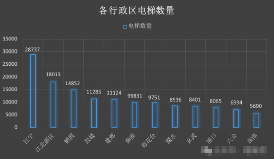 南京市12个行政区在用电梯分布情况如下,其中江宁区电梯数量最多28737台;高淳区电梯数量最少5690台。